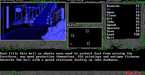Gameplay is somewhat reminiscent of games like Shadowgate, Deja Vu and Uninvited. You use a number of verb options like "Go" and "Open" (which are thankfully selectable by clicking on them or using the function keys rather than typing) to get around the environment, pick up various objects, and very likely find your way to an untimely death. Save often! Don't feel too bad if you end up having to consult a walkthrough either...